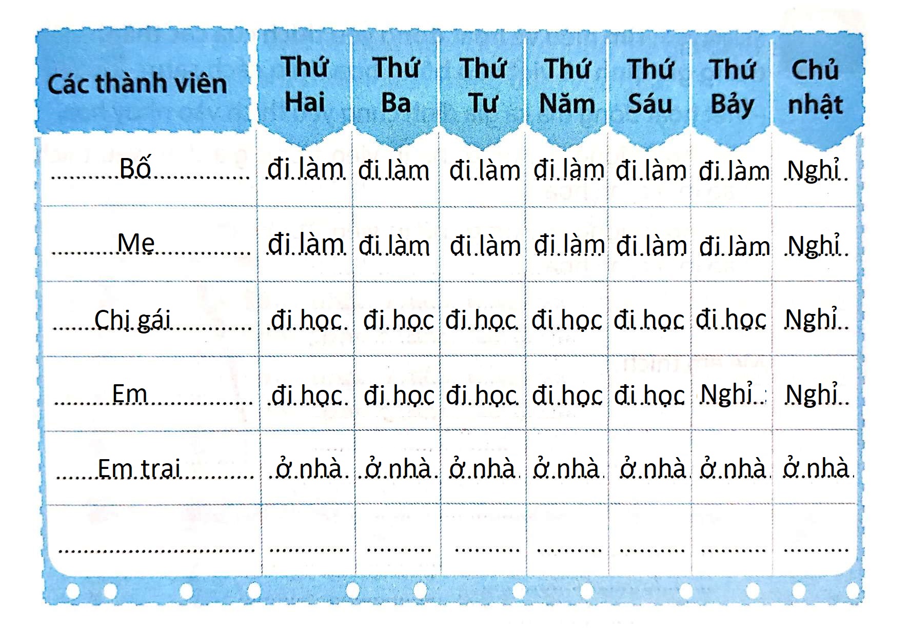 Tìm hiểu về thời gian biểu của các thành viên trong gia đình và ghi vào bảng sau: