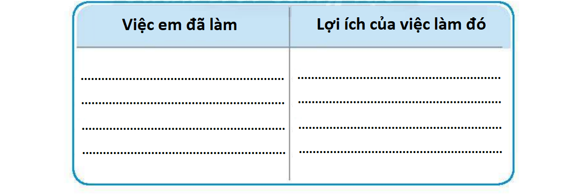 – Trong bài tập 3 em đã liệt kê những việc làm xây dựng hình ảnh đẹp của em, trong những việc làm đó em đã thực hiện việc nào? Sau khi thực hiện những việc làm đó em thấy việc đó có lợi ích gì không?