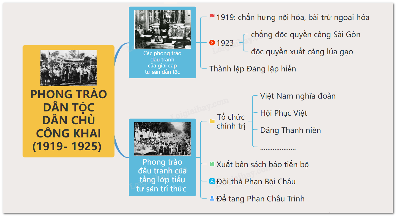 Tóm tắt phong trào dân tộc, dân chủ công khai (1919 – 1925): Các phong trào đấu tranh của giai cấp tư sản dân tộc và tầng lớp tiểu tư sản trí thức.
