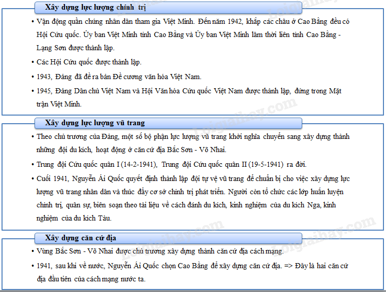 – Xây dựng lực lượng chính trị, lực lượng vũ trang, căn cứ địa cách mạng và thời kì gấp rút chuẩn bị khởi nghĩa vũ trang giành chính quyền.