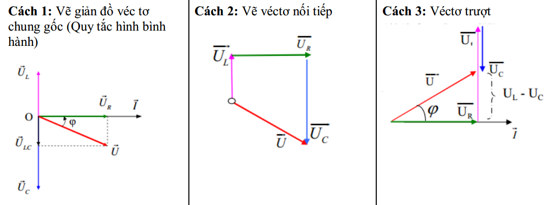 Tùy vào từng bài cụ thể, có thể vẽ các véctơ điện áp nối tiếp nhau dựa theo thứ tự của từng mạch điện hoặc vẽ chung gốc. Muốn có mối liên hệ của đại lượng cần tìm và đại lượng đã cho, thường dùng một số liên hệ sau: