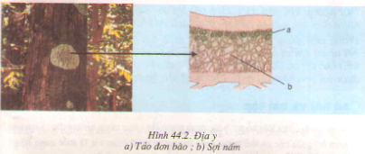 – Ở địa y, các sợi nấm hút nước và muối khoáng từ môi trường cung cấp cho tảo, tảo hấp thu nước, muối khoáng và năng lượng ánh sáng mặt trời tổng hợp nên các chất hữu cơ, nấm và tảo đều sử dụng các sản phẩm hữu cơ do tảo tổng hợp (hình 44.2).