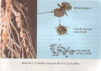 – Vi khuẩn sống trong nốt sần ở rễ cây họ Đậu (hình 44.3).