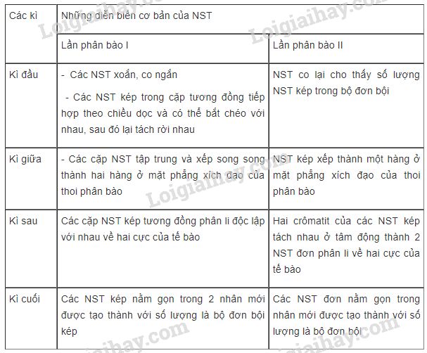 Bảng 10 : Những biến đổi cơ bản của NST ở các kì của giảm phân