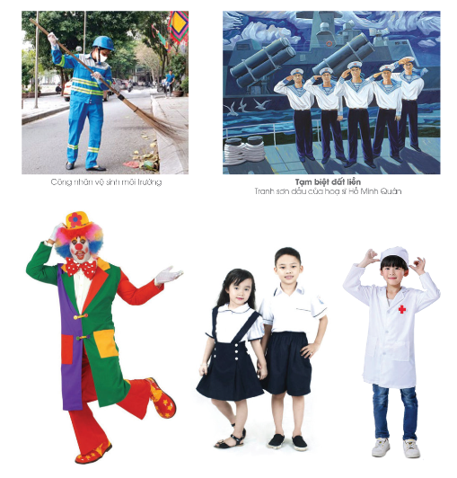 Em hãy kể tên công việc của nhân vật trong các hình ảnh dưới đây, nêu đặc điểm của mỗi trang phục