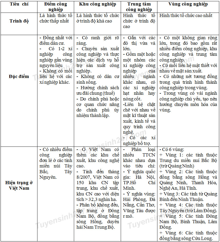 Bảng so sánh các hình thức tổ chức lãnh thổ công nghiệp ở nước ta: