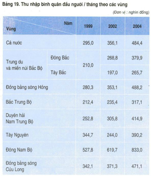 – Các vùng có mức thu nhập bình quân đầu người thấp hơn mức trung bình cả nước là : Đông Bắc (379,9), Tây Bắc (265,7), Bắc Trung Bộ (317,1), Tây Nguyên (390,2), Duyên hải Nam Trung Bộ (414,9), đồng bằng sông Cửu Long (471).