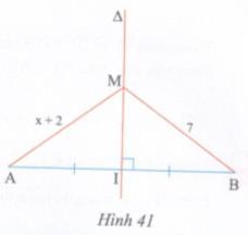 Ở hình 41, biết \(\Delta\) là đường trung trực của đoạn thẳng AB. Điểm M thuộc đường \(\Delta\), MA = x + 2, MB = 7. Tính x ?