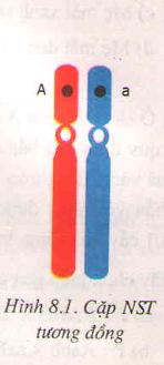 Do đó, các gen trên NST cũng tổn tại thành từng cặp tương ứng (hình 8.1). Bộ NST chứa các cặp NST tương đồng gọi là bộ NST lưỡng bội, được kí hiệu là 2n NST Bộ NST trung giao tử chỉ chứa một NST của mỗi cặp tương đồng được gọi là bộ NST đơn bội, kí hiệu là n NST.