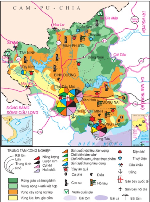 – Trung tâm công nghiệp: Thành phố Hồ Chí Minh, Biên Hoà, Vũng Tàu,… Thành phố Hồ Chí Minh chiếm khoảng 50% giá trị sản xuất công nghiệp toàn vùng.