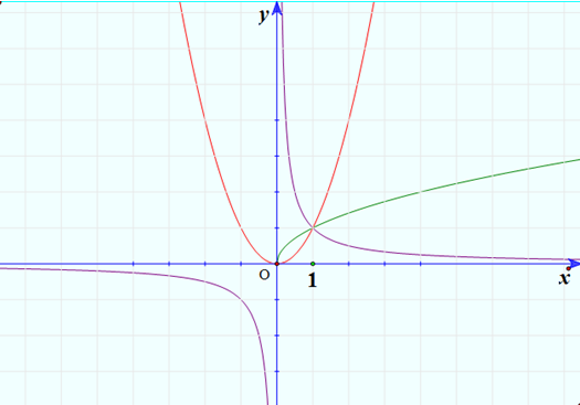 Đồ thị của hàm số \(y = {x^{ – 1}}\): đường màu tím.