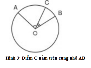Hãy chứng minh đẳng thức \( sđ \overparen {AB}=sđ \overparen {AC}+sđ \overparen {CB}\) trong trường hợp điểm C nằm trên cung nhỏ AB (h.3).