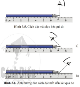 Khi đặt mắt nhìn như hình 3.6a hoặc hình 3.6b thì ảnh hưởng thế nào đến kết quả đo? Dùng thước và bút chì kiểm tra lại kết quả của em.