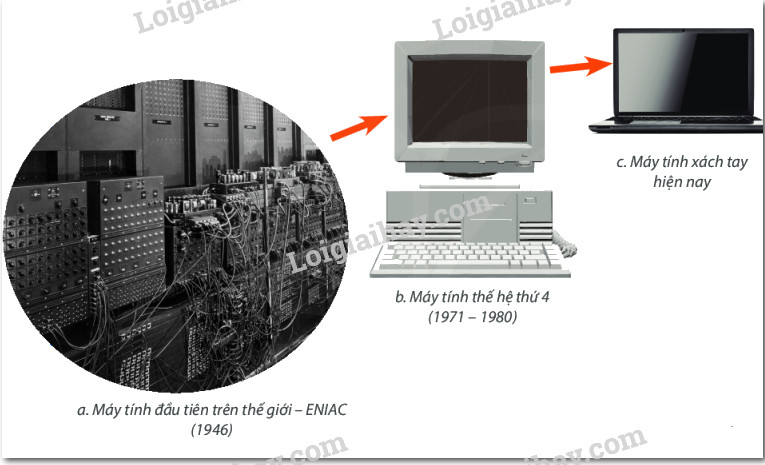 Quan sát hình 1, em hãy chỉ ra những điểm thay đổi theo thời gian của máy tính điện tử. Theo em, sự thay đổi theo thời gian như vậy được hiểu là gì?