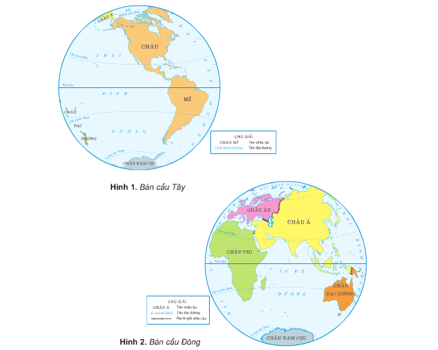 1. Tìm các đại dương trên quả Địa cầu hoặc trên Bản đồ Tự nhiên Thế giới. 2. Dựa vào hình 1 và hình 2, hãy cho biết: + Thái Bình Dương giáp các châu lục và đại dương nào? + Đại Tây Dương giáp các châu lục và đại dương nào? + Ấn Độ Dương giáp các châu lục và đại dương nào? + Bắc Băng Dương giáp các châu lục và đại dương nào?