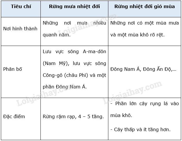 – Nêu sự khác nhau của rừng mưa nhiệt đới và rừng nhiệt đới gió mùa.