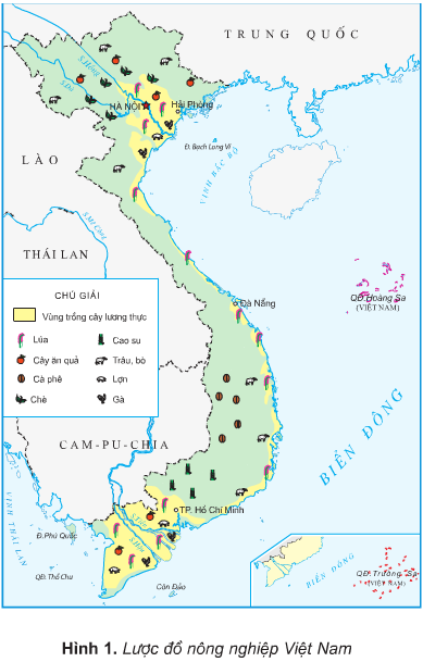 Quan sát kí hiệu các cây trồng ở lược đồ hình 1, kể tên một số cây trồng nước ta và cây được trồng nhiều nhất.