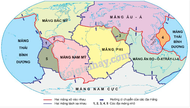 – Dựa vào chú giải, tìm trên hình các địa mảng xô vào nhau và đới tiếp giáp của các địa mảng đó.