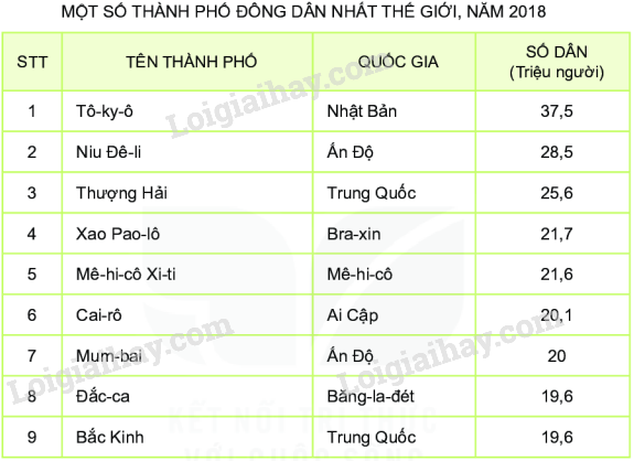 1. Năm thành phố đông dân nhất thế giới năm 2018: Tô-ky-ô, Niu Đê-li, Thượng Hải, Xao Pao-lô, Mê-hi-cô Xi-ti.