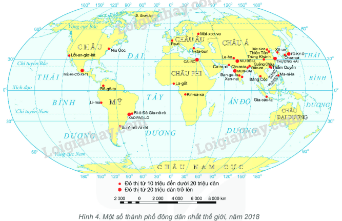 Dựa vào bản đồ hình 4 và bảng số liệu trang 182, em hãy: 1. Kể tên năm thành phố đông dân nhất thế giới năm 2018. 2. Cho biết châu lục nào có nhiều siêu đô thị nhất.