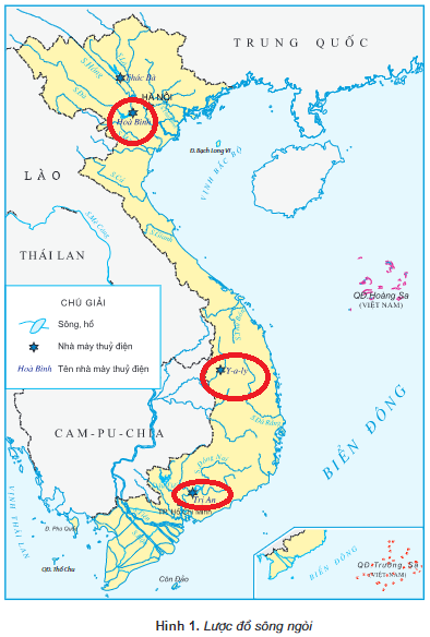 Chỉ trên hình 1 vị trí của các nhà máy thủy điện Hòa Bình, Y-a-ly và Trị An.