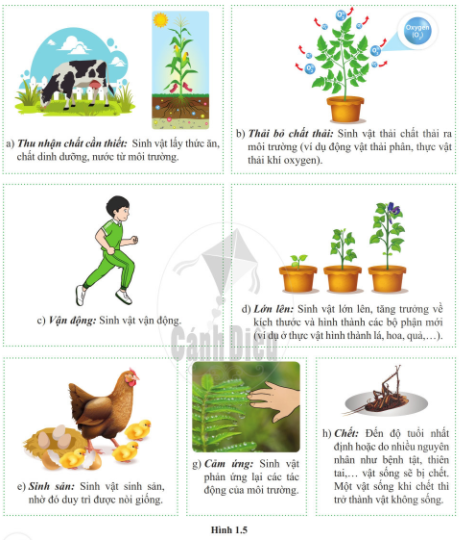 Quan sát hình 1.5 và cho biết những đặc điểm giúp em nhận biết vật sống