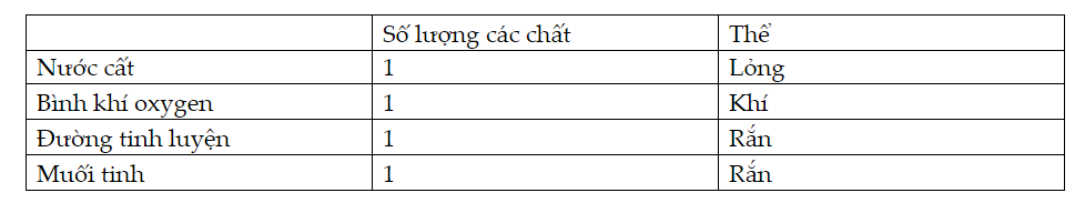 Em có nhận xét gì về số lượng các chất có trong nước cất, bình khí oxygen y tế, sản phẩm đường tinh luyện và muối tinh? Các chất đó ở thể nào?