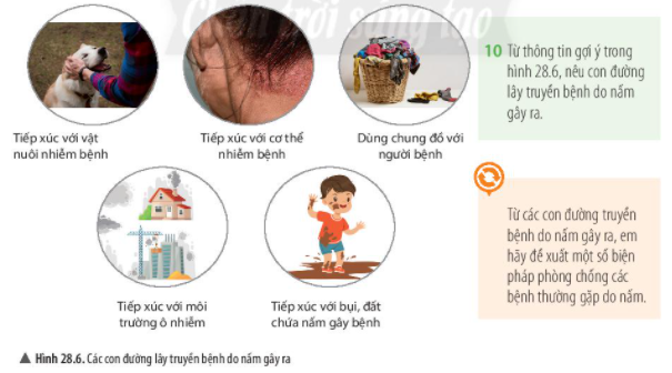 Từ thông tin gợi ý trong hình 28.6, nêu con đường lây truyền bệnh do nấm gây ra.