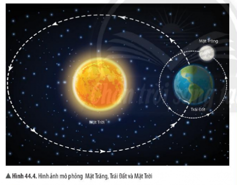 Trong hình 44.4, em hãy chỉ ra phần bề mặt của Mặt Trăng được Mặt Trời chiếu sáng và phần bề mặt của Mặt Trăng mà ở Trái Đất có thể nhìn thấy.