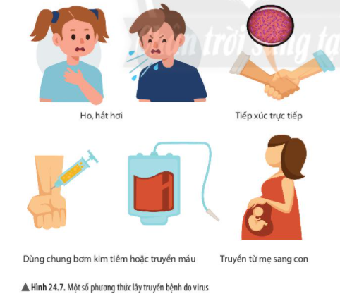 Từ thông tin gợi ý trong hình 24.7, hãy cho biết bệnh do virus có thể lây truyền qua những con đường nào?
