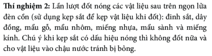 – Vật liệu dẫn nhiệt: đinh sắt, dây đồng, mẩu nhôm do kẹp sắt bị nóng