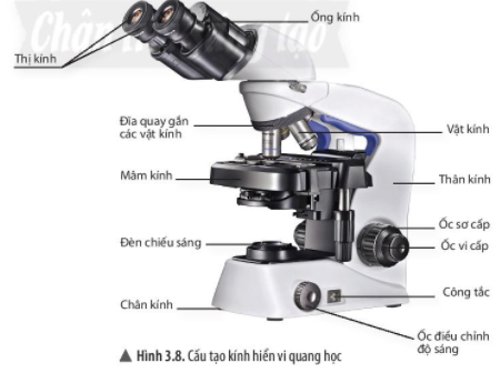 Quan sát hình 3.8, chỉ rõ bộ phận cơ học và quang học trong cấu tạo kính hiển vi quang học.
