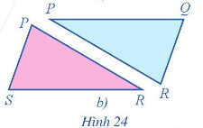 b) Cắt hình bình hành PQRS theo đường chéo PR thành hai tam giác PQR (tô màu xanh) và tam giác RSP (tô màu hồng) (Hình 24 a), b)).