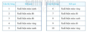 Một hộp có 1 quả bóng xanh, 1 quả bóng đỏ và 1 quả bóng vàng; các quả bóng có kích thước và khối lượng như nhau. Mỗi lần bạn Yến lấy ngẫu nhiên một quả bóng trong hộp, ghi lại màu của quả bóng lấy ra và bỏ lại quả bóng đó vào hộp. Sau 10 lần lấy bóng liên tiếp, bạn Yến có kết quả thống kê như sau: