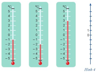 b) Nêu số đo nhiệt độ được chỉ trong mỗi nhiệt kế và biểu diễn các số đó trên trục số thẳng đứng ở Hình 4.