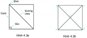 Quan sát hình 4.3a. 1. Nêu tên các đỉnh, cạnh, đường chéo của hình vuông ABCD (h.4.3b). 2. Dùng thước thẳng đo và so sánh độ dài các cạnh của hình vuông, hai đường chéo của hình vuông. 3. Dùng thước đo góc để đo và so sánh các góc của hình vuông.