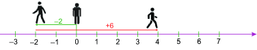 Di chuyển sang trái 2 đơn vị là \(\left( { – 2} \right)\), sang phải 6 đơn vị là \(\left( { + 6} \right)\). Người đó dừng lại tại điểm +4 nên: \(\left( { – 2} \right) + \left( { + 6} \right) =  + 4\).