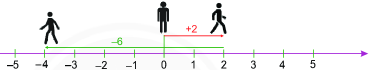 Di chuyển sang phải 2 đơn vị là \(\left( { + 2} \right)\), sang trái 6 đơn vị là \(\left( { – 6} \right)\). Người đó dừng lại tại điểm \( – 4\) nên: \(\left( { + 2} \right) + \left( { – 6} \right) =  – 4\).