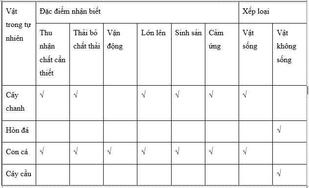 Hãy lấy ví dụ về vật sống, vật không sống trong tự nhiên và đánh dấu tích vào những đặc điểm để nhận biết vật đó là vật sống hay vật không sống theo gợi ý trong bảng 1.3