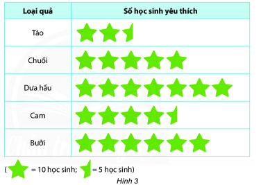 Biểu đồ tranh dưới đây cho ta thông tin về loại quả yêu thích của các bạn học sinh khối lớp 6.