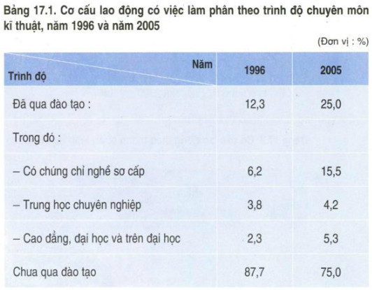 Từ bảng 17.1, hãy so sánh và rút ra nhận xét về sự thay đổi cơ cấu lao động có việc làm phân theo trình độ chuyên môn kĩ thuật ở nước ta