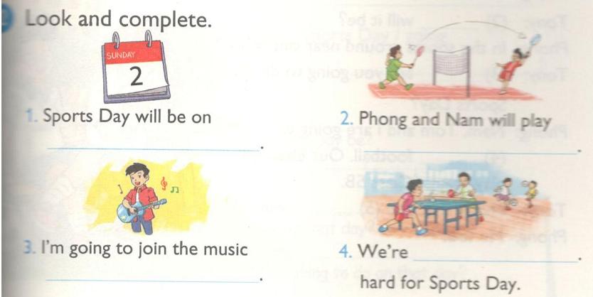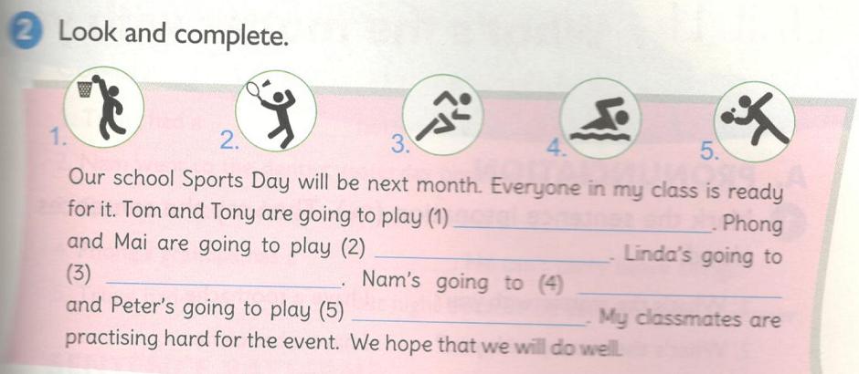 Hội thao của trường tôi sẽ diễn ra vào tháng tới. Mọi người trong lớp đều đang chuẩn bị cho nó. Tom và Tony sẽ chơi bóng rổ. Phong và Mai sẽ chơi cầu lông. Linda sẽ chạy. Nam sẽ bơi và Peter sẽ chơi bóng bàn. Các bạn lớp tôi đang luyện tập chăm chỉ cho sự kiện này. Chúng tôi hy vọng chúng tôi sẽ làm tốt.
