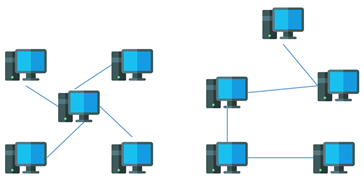Phòng thư viện của trường có 5 máy tính cần kết nối thành một mạng. Có thể có nhiều cách kết nối, ví dụ như Hình 2.3. Em hãy vẽ hai cách khác để kết nối chúng thành một mạng.