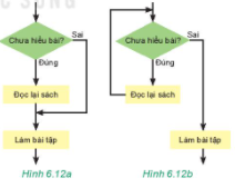 Bạn An cho rằng: “Sơ đồ khối ở Hình 6.12a thể hiện rằng nếu chưa hiểu bài thì việc đọc lại sách chỉ thực hiện một lần rồi làm bài tập. Còn sơ đồ khối ở Hình 6.12b thể hiện rằng nếu chưa hiểu bài thì việc đọc lại sách và làm bài tập sẽ thực hiện nhiều lần.”