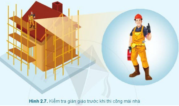 Người công nhân A đang đi kiểm tra giàn giáo trước khi thi công mái nhà. Quan sát hình 2.7 và cho biết người công nhân này đã đảm bảo an toàn lao động cho bản thân chưa? Giải thích vì sao?