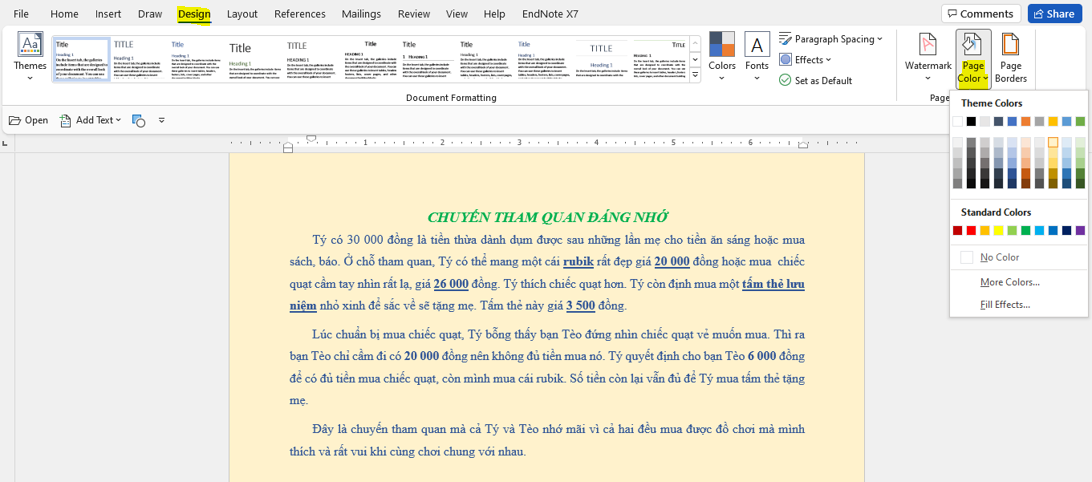 – Tô màu nền: Design => Page Color => Chọn màu em thích.