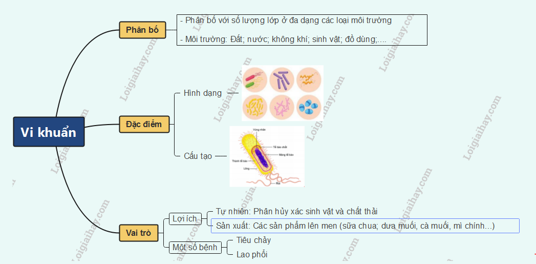 – Vi khuẩn kích thước hiển vi, có cấu tạo tế bào nhân sơ gồm thành tế bào, màng tế bào, chất tế bào và vùng nhân. Một số vi khuẩn có lông bơi hoặc roi bơi.